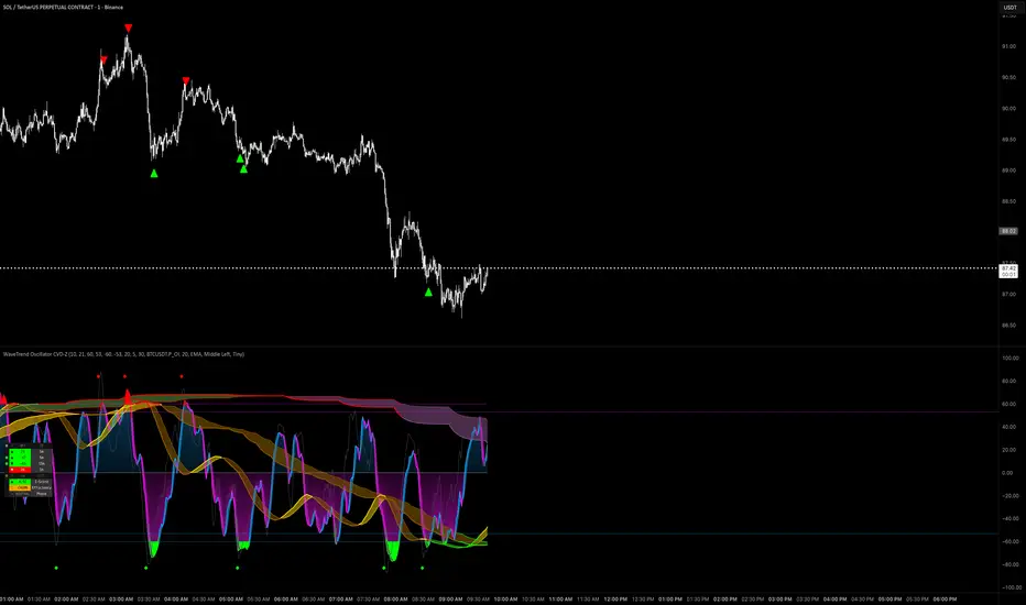 WaveTrend momentum overlaid with CVD Z-score style normalization for flow/imbalance confirmation.