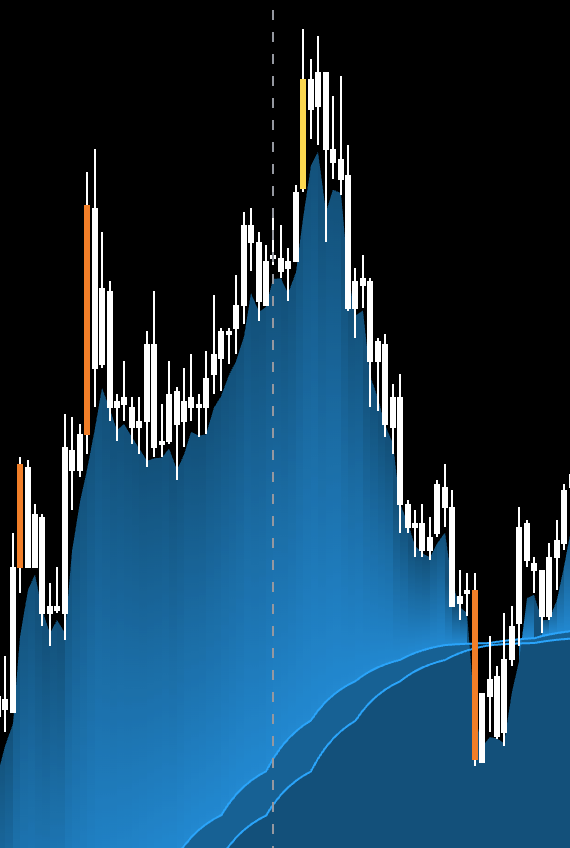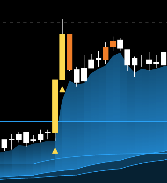 Candles with volume exceeding 500% of the average are flagged with a yellow color and triangle markers. These represent significant market participation or "market maker" activity.