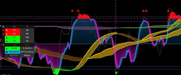 The WaveTrend Oscillator CVD-Z indicator fuses two independent analytical systems—a multi-timeframe WaveTrend oscillator and a Cumulative Volume Delta (CVD) Z-Score—into a single pane by scaling the CVD z-score into the WaveTrend's ±100 range.
