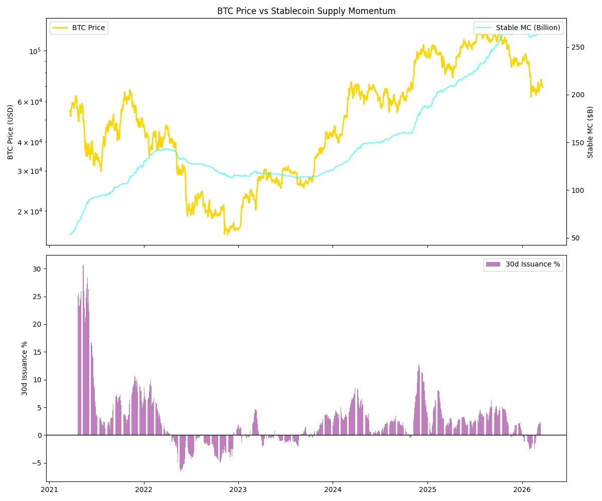 Stablecoin momentum acts as an intermediate trend bias. If stablecoin supply is shrinking, the market is structurally starved for bids.