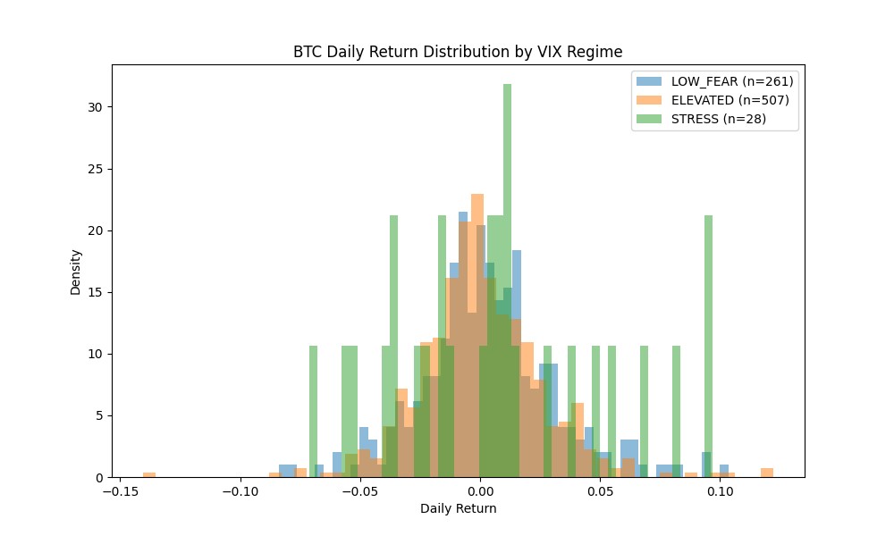 Crypto behaves as a high-beta risk asset. We segmented market conditions into 'Low Fear', 'Elevated', and 'Stress' regimes based on the VIX.