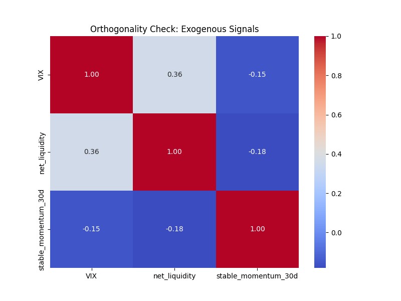 The true test of any indicator set is orthogonality—are they just different ways of measuring the same thing? We ran cross-correlations across the final signal set, and impressively, all signals exhibited a correlation of r < 0.4 with one another.