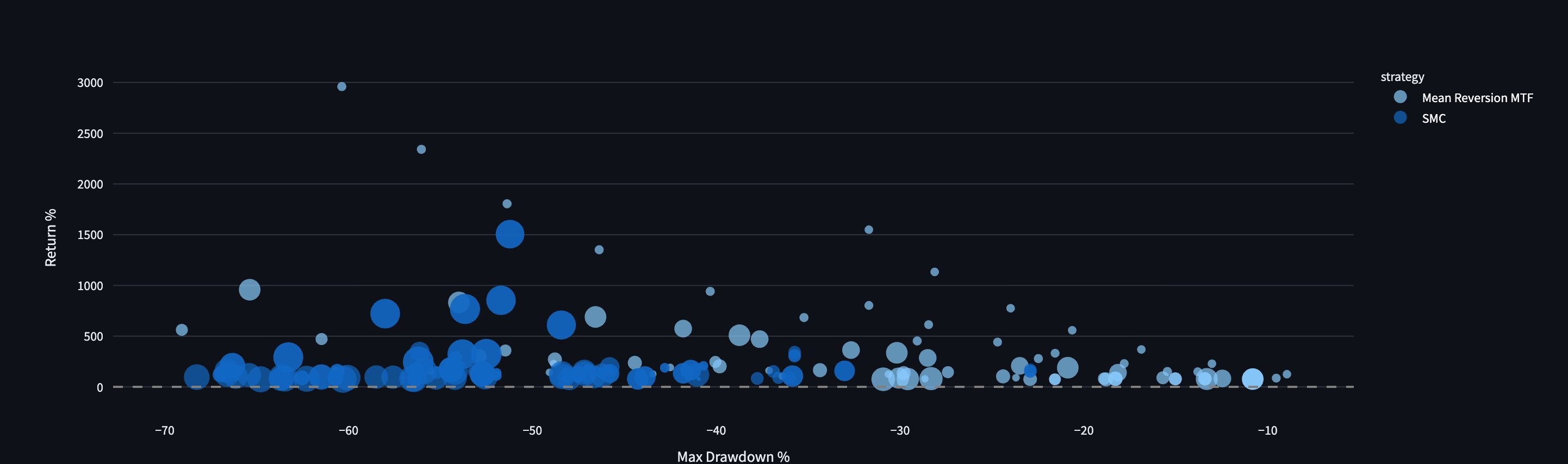 $SOL on 24m is a standout and when scaling with leverage PNL grows faster than drawdown. Results at 10x had 43,911% return with 61% drawdown in TradingView. Python blind test shows 991% with 40% drawdown.